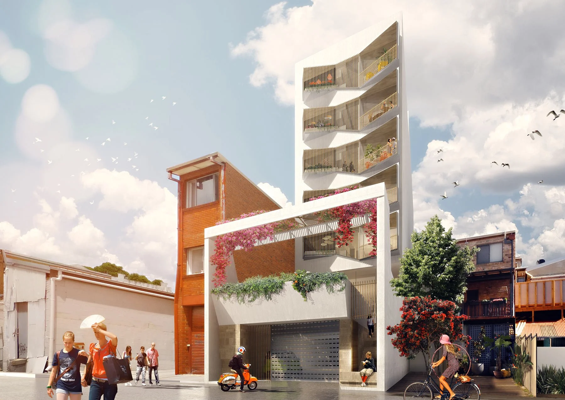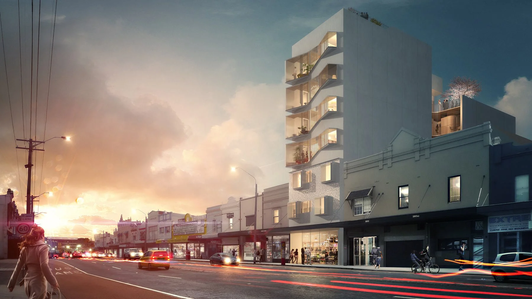 Our Client conceived of Graduate Housing as a demonstration project that sought an alternative to the mass site consolidation development proposed by the NSW Government’s WestConnex rollout for Parramatta Road. We have taken a single site with just over 8.0m frontage and developed a seven storey ‘light-court’ building with eleven highly adaptable apartments. Two flexible retail spaces flank a through-site connection at the ground level.