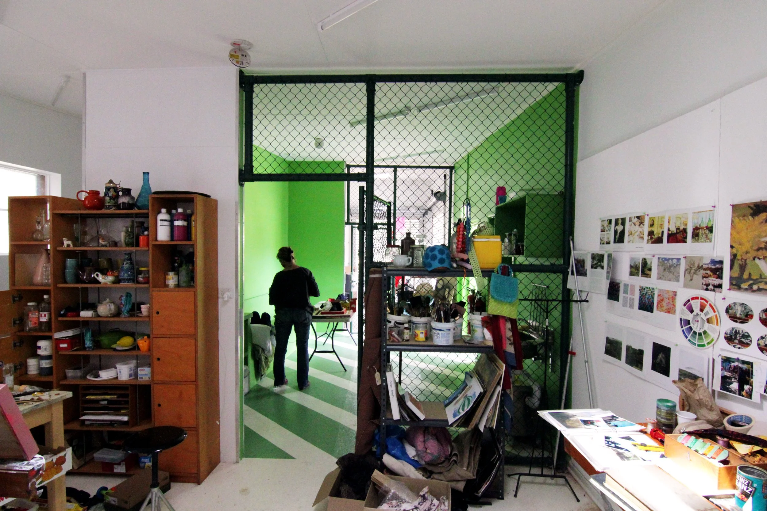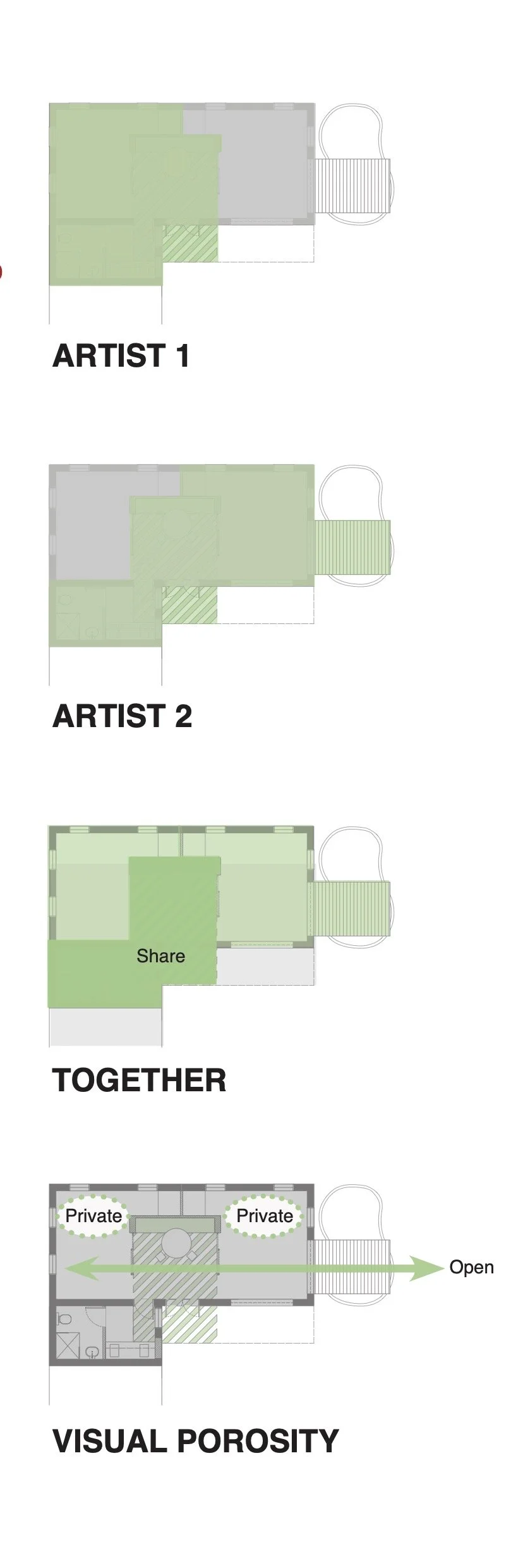A clear distinction is made between the the centrally located shared space in green and the artists studio areas in white. Our design approach makes a limited number of key moves, each carefully considered and each performing multiple tasks.