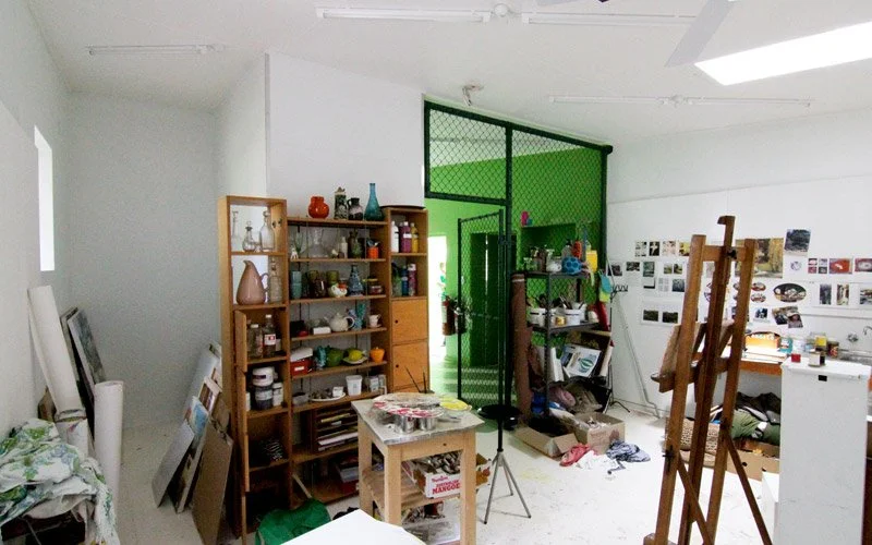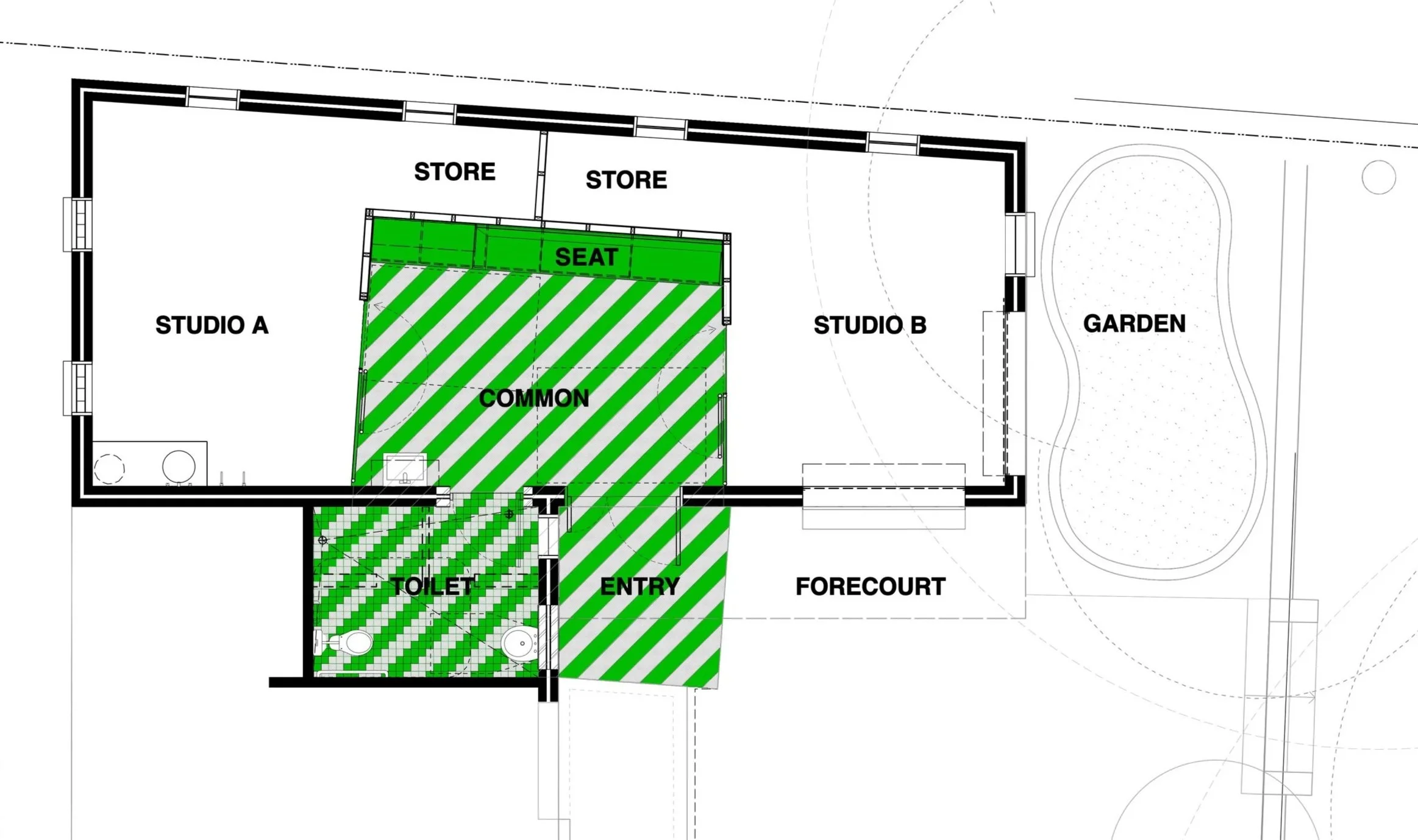 Firstly, we establish a flexible arrangement of private, open and common spaces allows the spatial adaptation to suit occupation by either artist or by both artists. Secondly, we work with colour and materials to curate the feel of each space and the relationship between them. A level of neutrality is maintained in each studio space providing a cleaner backdrop to the artists work. Finally, this stark whiteness is contrasted by a boldly striped green and graphically engaging common space, positioned centrally to the plan.