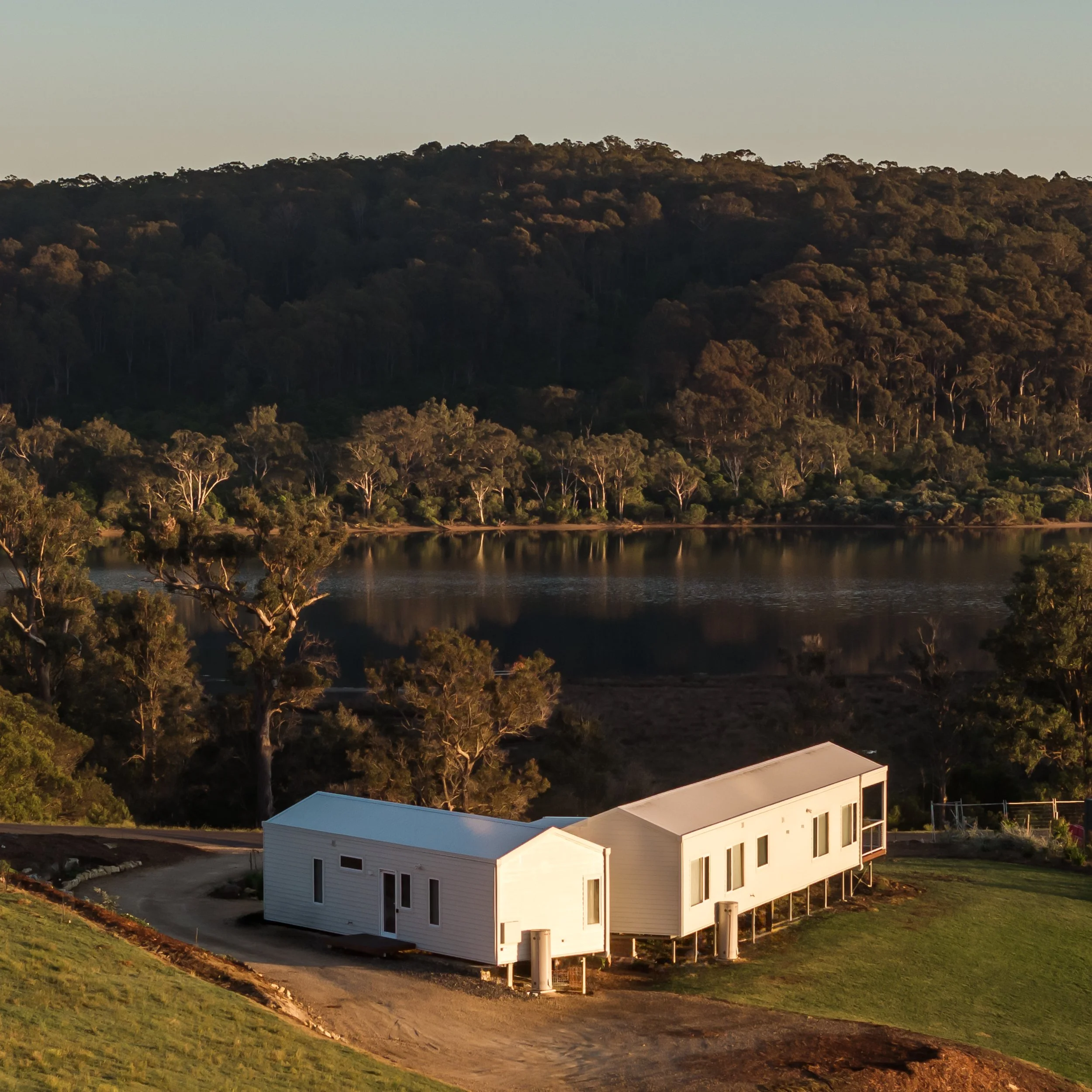 Passive systems: The home is zoned to isolate heating and cooling loads and provide acoustic separation. Pavilions are organised to maximise cross-ventilation, provide sheltered sun-filled outdoor space and capture views. Glazing is small and and strategically placed to temper summer heat loads but admit sun throughout the day in winter. A vaulted ceiling increases airflow and a sense of generosity in the space-efficient living area. Insulation is up-specified and includes underfloor insulation and BASIX compliance, both beyond manufactured home standards. Minimal earthworks through lightweight and elevated construction preserve the soil biome, wildlife movement and water table.
