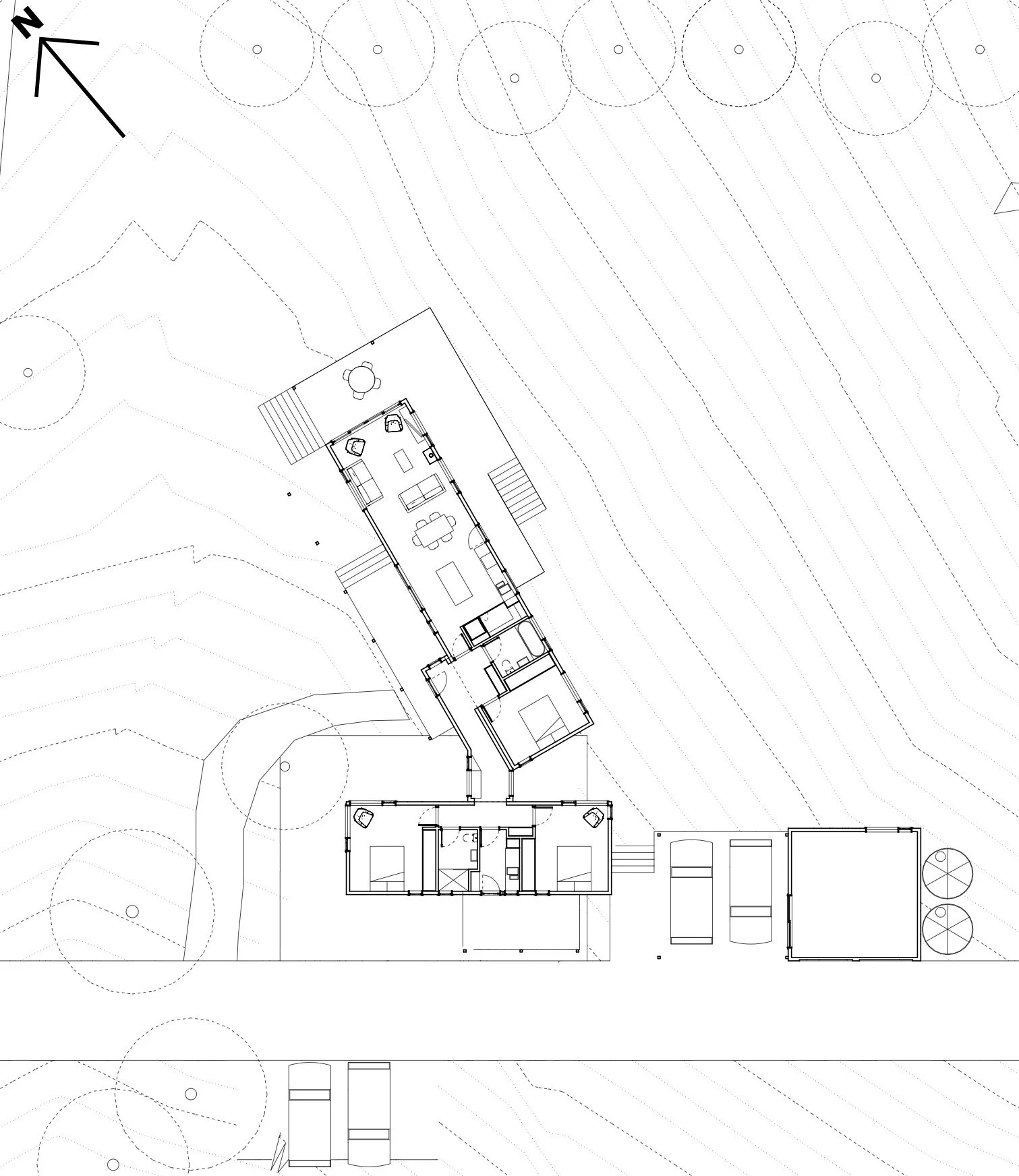 The skewed pavilions established a geometric 'fit' with the site boundary and contours, good solar access, and opposing water views to both river and ocean.