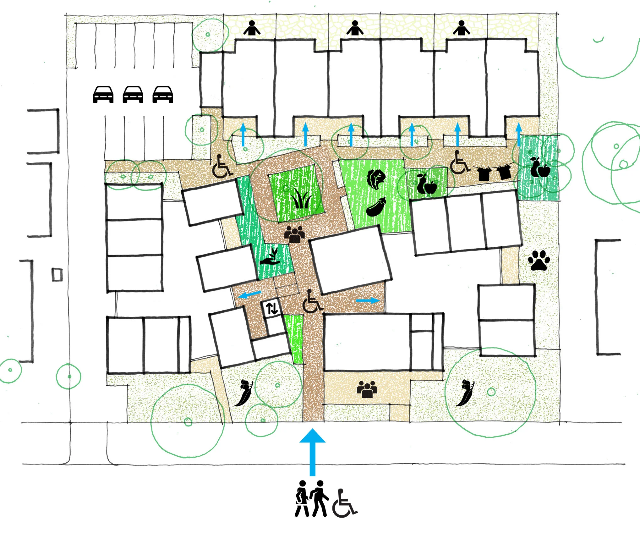 Common spaces include community gardens, a community hall, a library, kids play area, a co-working space, washing and drying spaces, a pet yard and outdoor cooking areas.